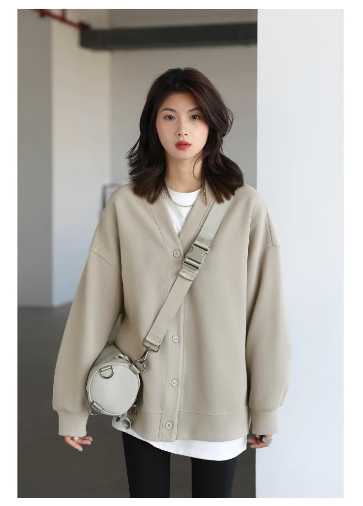 Crafted from a premium cotton-polyester-spandex blend, this Korean V-neck zip-up sweatshirt delivers effortless sophistication for the modern wardrobe. The loose, relaxed silhouette with drop sleeves creates a contemporary aesthetic, while the medium-weight pearl cotton fabric provides substantial comfort without excess bulk. Featuring a single-breasted closure and full-length sleeves, this piece balances casual ease with refined simplicity. The neutral solid colourway ensures versatile styling across seasons, making it an essential layering piece for autumn and winter. Slight stretch elasticity accommodates natural movement, while the thick fabric construction ensures durability through repeated wear.