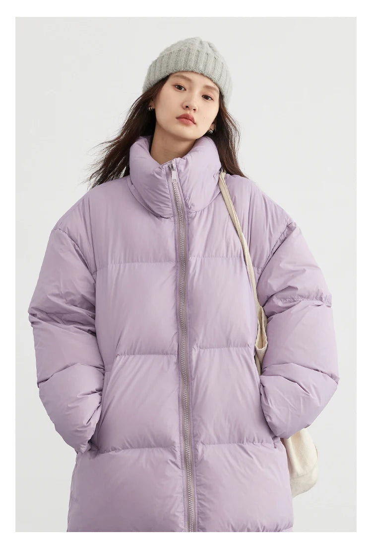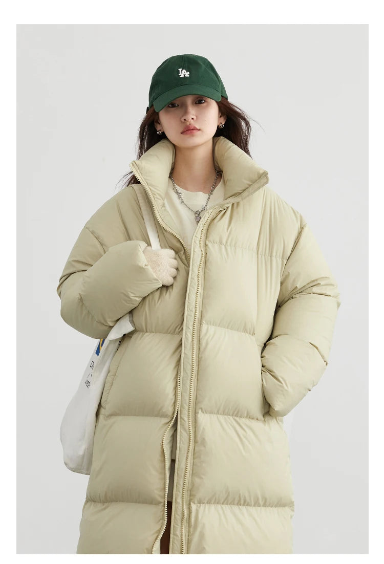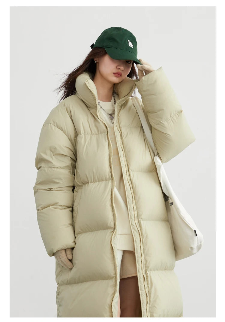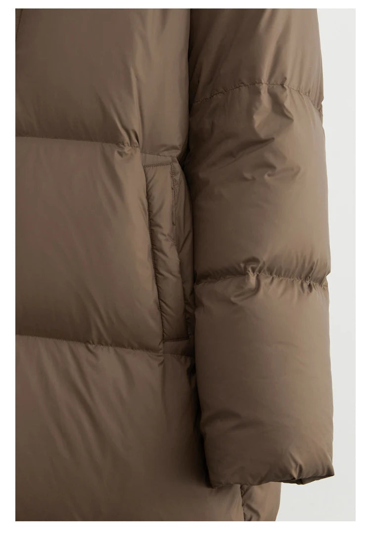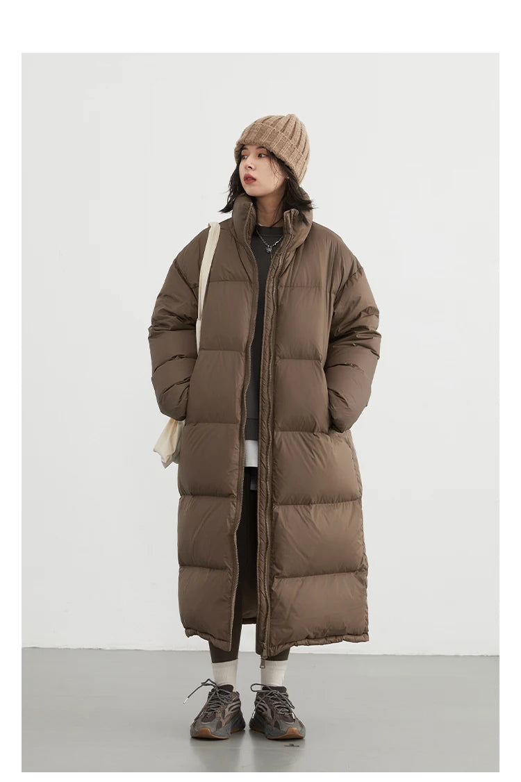 Experience superior warmth with this expertly crafted long down jacket, engineered for the demanding autumn and winter seasons. Featuring premium 90% white duck down filling and a substantial 250-300g weight, this piece delivers exceptional insulation without compromise. The durable nylon exterior paired with a soft polyester lining creates a refined silhouette that transitions seamlessly from casual outings to layered styling. Its full-length design and generous proportions ensure comprehensive coverage, while the convenient front zipper closure offers effortless adjustment. Designed for the discerning woman seeking reliable cold-weather protection with understated elegance.